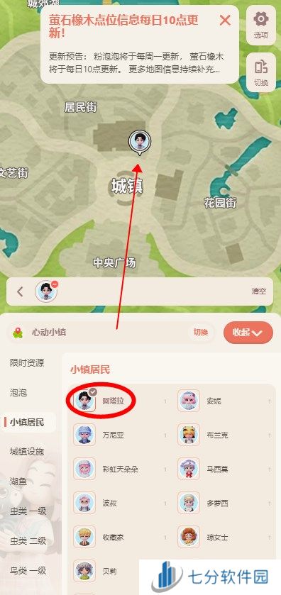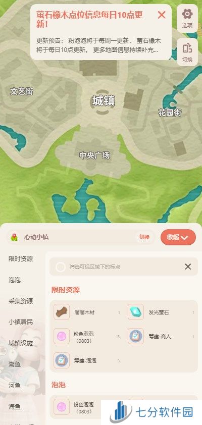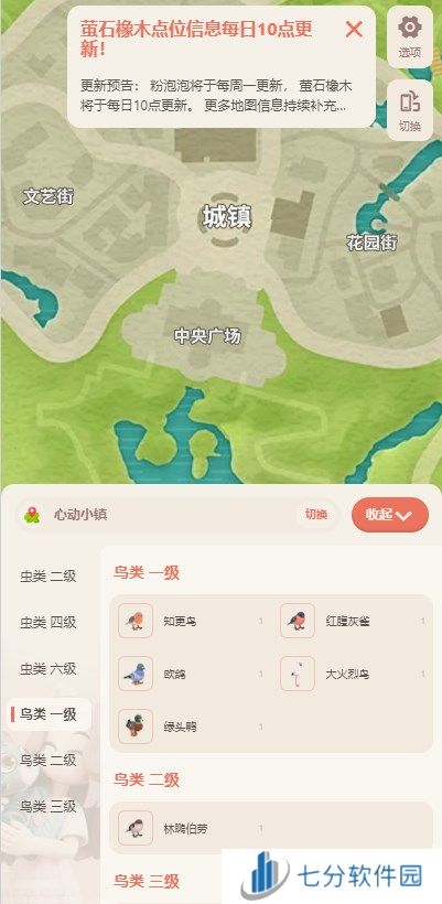 心动小镇地图使用教程:1、地图工具进入之后可以查看每日萤石橡木点位信息,每日十点就会更新,下面还有鸟类,小镇居民,城镇设施等点位地图可以使用。