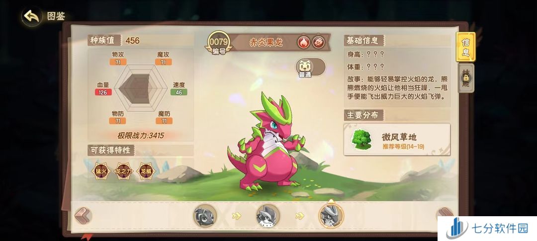 好吃的火龙果,但是却有极强的战斗续航,特性龙之力,赋予了它使用龙系技能时,可以恢复自身8%生命值的天赋,进化后的赤炎果龙种族值可达456,血量属性来到了126,大大提升了在对战时,拖延敌方精灵节奏的能力
