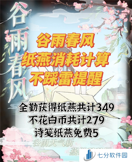 代号鸢谷雨春风全勤可获得纸燕公349个,不花白金币共计279个,诗笺纸燕免费5个。具体的活动攻略和纸燕获取见下。