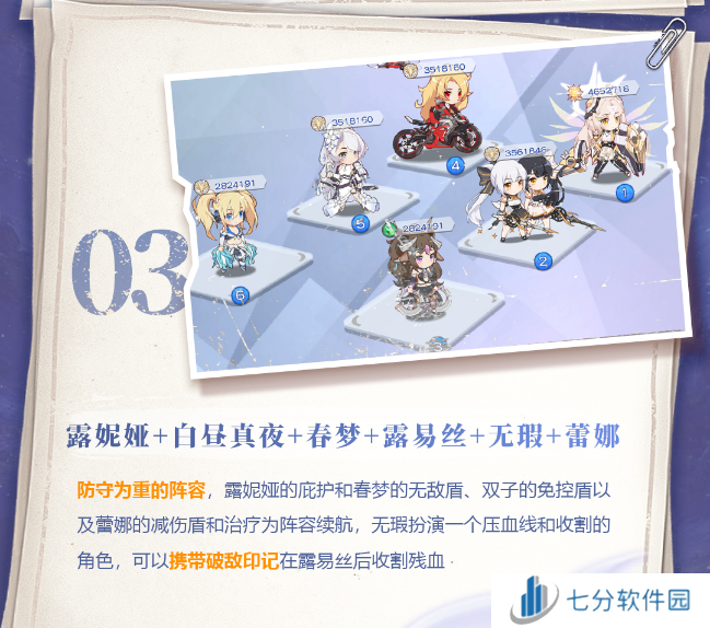 防守为重的阵容,露妮娅的庇护和春梦的无敌盾、双子的免控盾以及蕾娜的减伤盾和治疗为阵容续航,无瑕扮演一个压 血线和收割的角色,可以携带破敌印记在露易丝后收割残血。