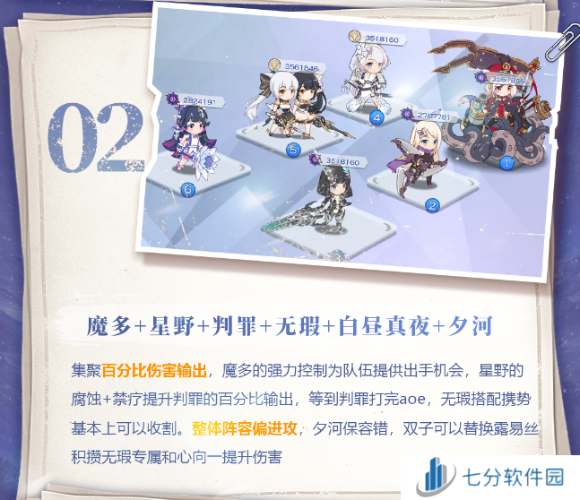 集聚百分比伤害输出,魔多的强力控制为队伍提供出手机会,星野的腐蚀+禁疗提升判罪的百分比输出,等到判罪打完aoe,无瑕搭配携势基本上可以收割。整体阵容偏进攻,夕河保容错,双子可以替换露易丝积攒无瑕专属和心向一提升伤害。