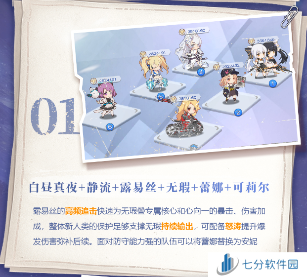 露易丝的高频追击快速为无瑕叠专属核心和心向- -的暴击、伤害加成,整体新人类的保护足够支撑无瑕持续输出,可配备怒涛提升爆发伤害弥补后续。面对防守能力强的队伍可以将蕾娜替换为安妮。