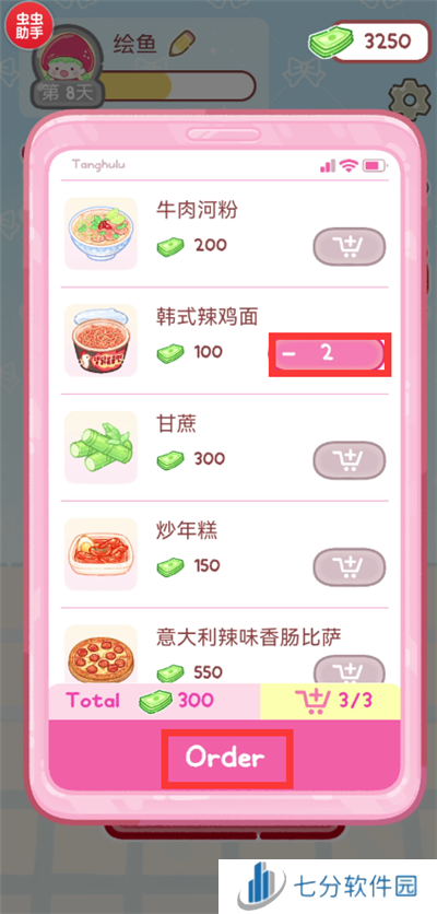 2、在点餐界面可以看到各种食物,选择好想要的食物加入购物车,然后点击Order;