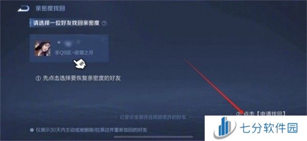 4、这时在出现的选项中,选择要找回亲密度的好友,接着点击下方的申请按钮
