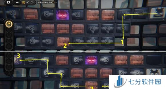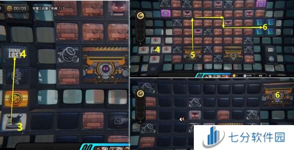 3、接着去4区域,4区域上下左右4个控制机关,可以控制5机械移动,将5机械按照下图路线,移动到6区域即可